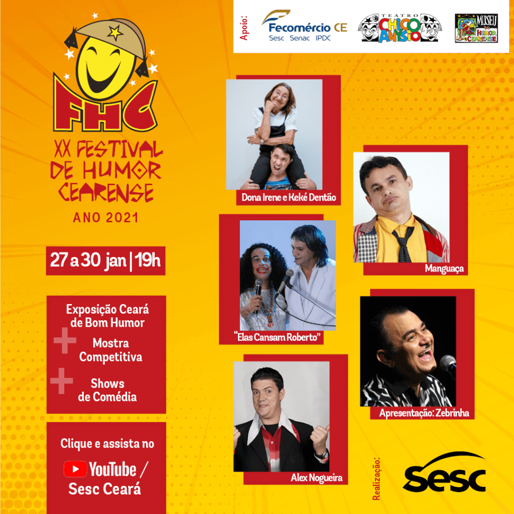 O evento será todo num formato on-line, no canal do YouTube Sesc Ceará acontecerá entre os dias 27 e 30 de janeiro, sempre às 19h! A transmissão ocorrerá ao vivo direto do Teatro Chico Anysio, não perca!