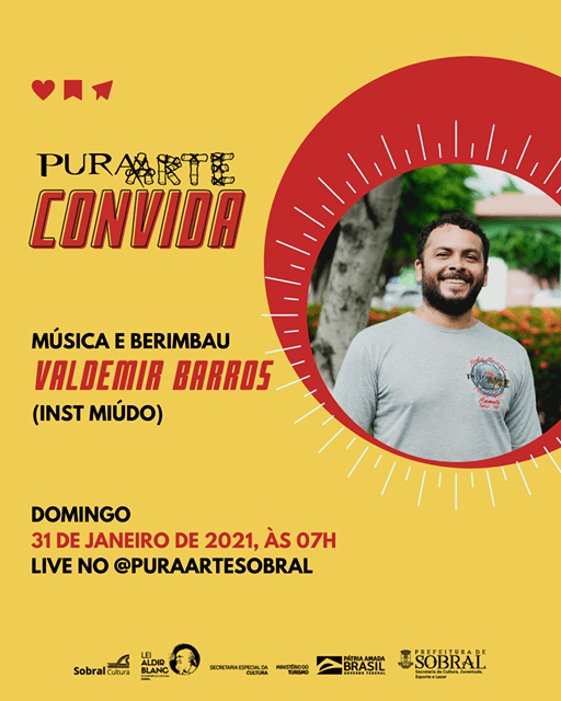Neste domingo (31/01), às 07h, o grupo PuraArte Capoeira, realiza mais uma live do projeto PuraArte Convida no instagram.com/puraartesobral com Valdemir Barros (Instrutor Miúdo).