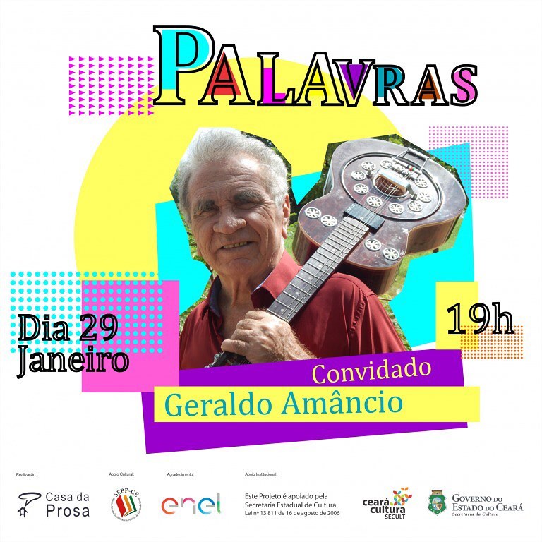 No próximo dia 29 de janeiro (sexta-feira), às 19h, acontece a Abertura-Live do Projeto Palavras, com a participação do cantador Geraldo Amâncio.