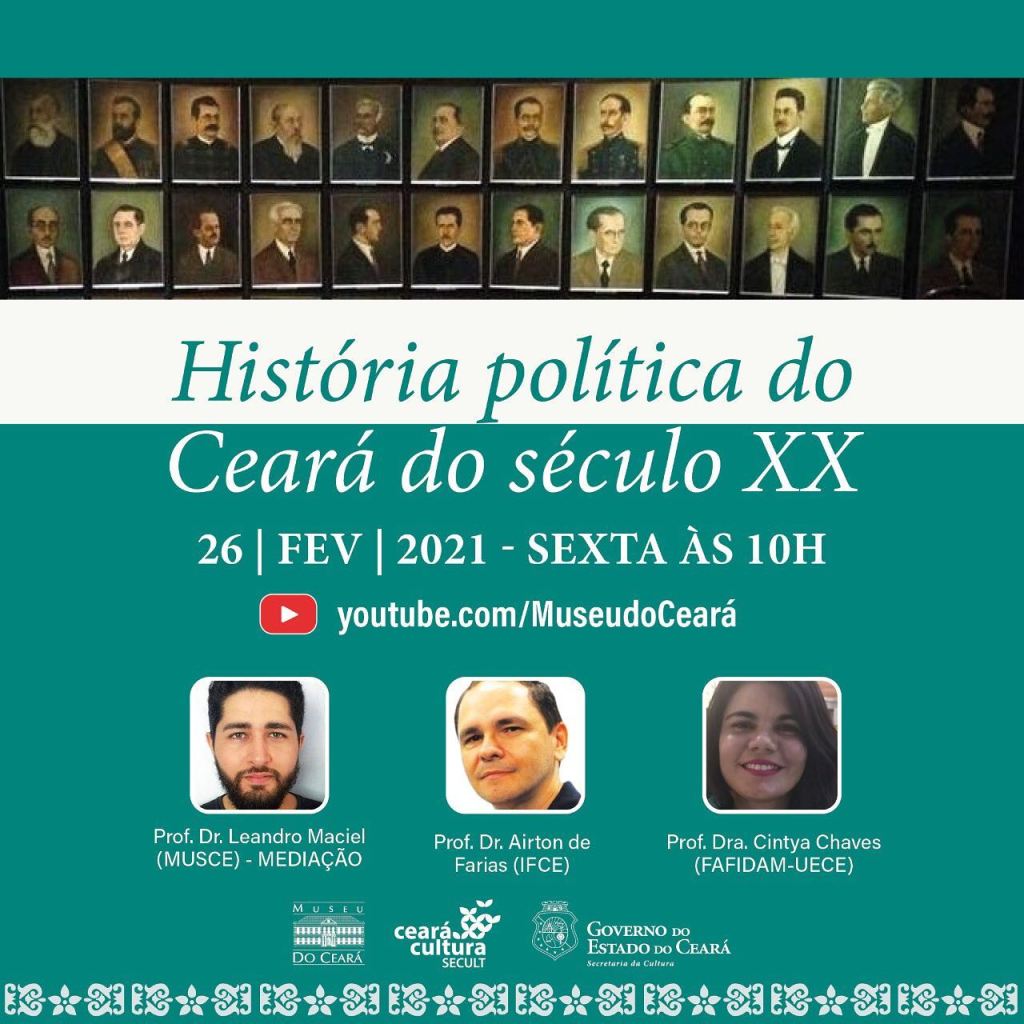 Nesta sexta-feira (26/02), às 10h, dando continuidade ao Webinário História do Ceará em Debate, vamos conversar sobre a história política do Ceará do século XX.