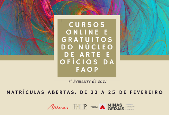 Estão abertas as matrículas para os cursos do Núcleo de Arte e Ofícios da Fundação de Arte de Ouro Preto | FAOP. Serão oferecidas 275 vagas, distribuídas em 14 cursos online para adolescentes a partir de 11 anos, além de jovens e adultos com interesse no conhecimento e formação em linguagens artísticas diversas. As matrículas poderão ser feitas até quinta-feira (25), AQUI, e as vagas serão preenchidas por ordem de envio deste formulário, sendo efetivadas mediante e-mail de confirmação.
