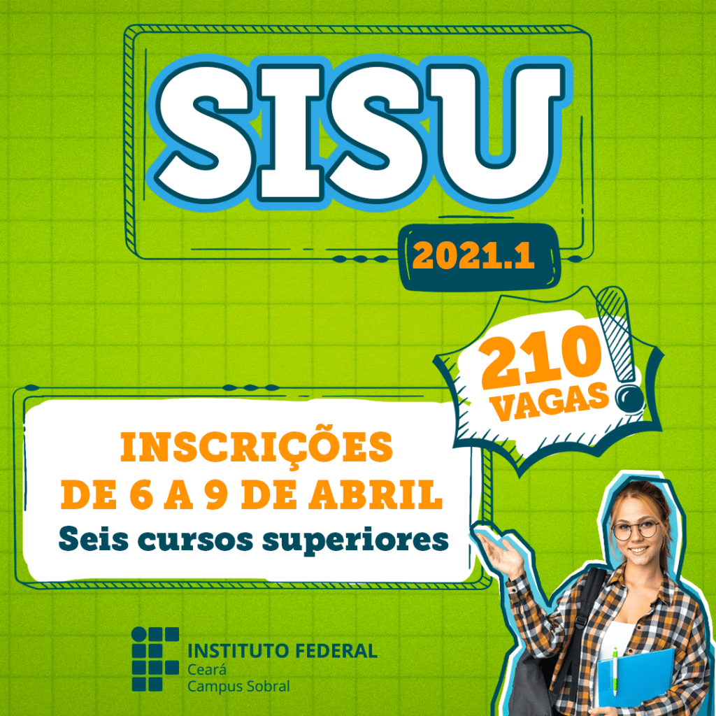O edital do SISU 2021.1 no IFCE e mais informações podem ser acessados em https://ifce.edu.br/sobral/noticias/abertas-inscricoes-para-cursos-superiores-em-sobral.