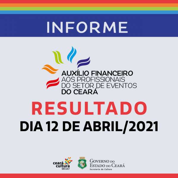 A Secretaria da Cultura do Estado do Ceará (Secult Ceará) informa que o resultado do Cadastro para o auxílio financeiro destinado aos profissionais do setor de eventos do Ceará será divulgado no dia 12 de abril, no site da secretaria, acompanhe.