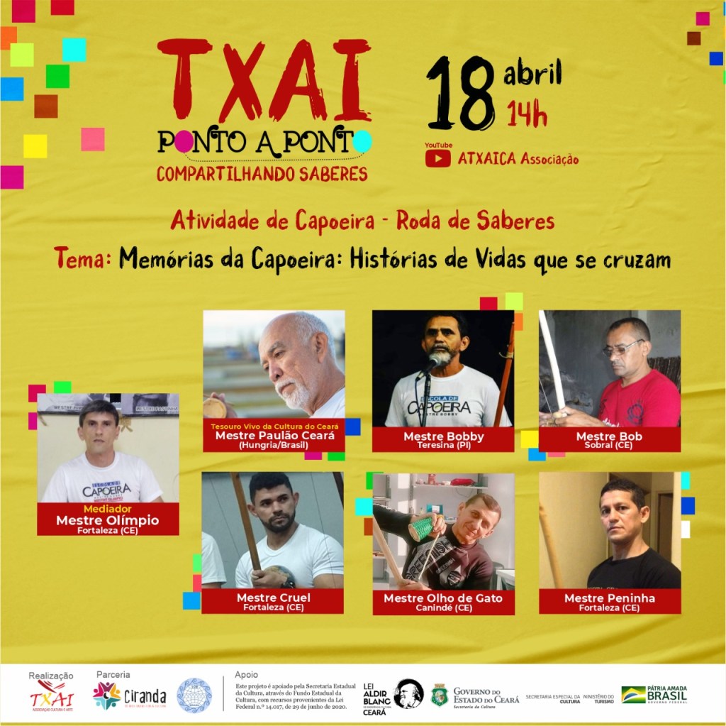 O projeto “Txai Ponto a Ponto – Compartilhando Saberes” consiste em ações culturais junto aos Mestres da Cultura, crianças, adolescentes e adultos em diversas atividades artísticas. A segunda ação do projeto, atividade de capoeira, será realizada dia 18 de abril, no domingo, às 14h, no Youtube da Associação Txai Cultura e Arte – ATXAICA. A live com o tema ”Memórias da Capoeira: Histórias de Vidas que se cruzam” com o convidado do Piauí, Mestre Bobby, do Ceará, participarão o Tesouro Vivo da Cultura do Ceará, Mestre Paulão Ceará, Mestre Bob, Mestre Cruel, Mestre Olho de Gato, Mestre Peninha e mediação do Mestre Olímpio. Esta atividade é acessível e contará com um intérprete de LIBRAS, durante toda a transmissão.
