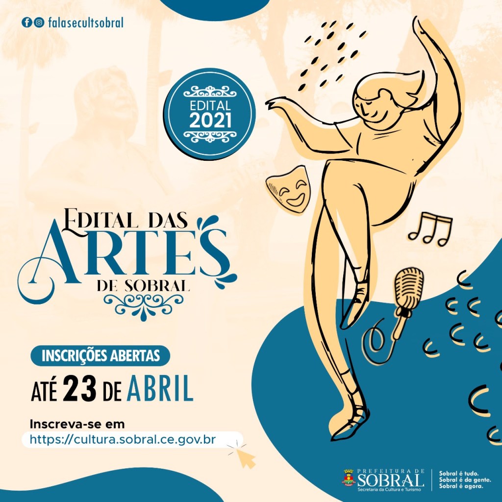 A Prefeitura de Sobral, por meio da Secretaria da Cultura e Turismo (Secult), lançou, na sexta-feira (09/04), o Edital Emergencial das Artes. A ação beneficiará até 123 projetos na área artística e cultural do município. As inscrições se iniciaram nesta segunda-feira (12/04) e podem ser realizadas até as 23h59 do dia 23 de abril, exclusivamente, na plataforma on-line do Mapa Cultural de Sobral.