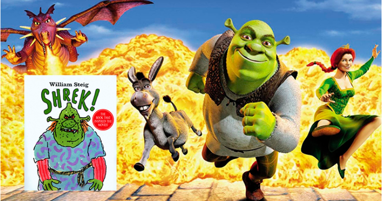 Antes de ser a série de filmes universalmente adorada, Shrek não era mais do que um livro infantil do autor e ilustrador William Steig. A história segue o primeiro filme em que Shrek se aventura para fora de seu pântano para explorar um mundo que nunca viu. Embora ele comece como um monstro mal-humorado, ele termina como um herói com verdadeiros valores e moral. Essa é basicamente a história, mas os filmes pegam essa premissa muito simples e a expandem exponencialmente. Outra diferença é que o ogro, nos livros, além de soltar raios pelos olhos e boca, mora no pântano com os pais, mas ao atingir a maior idade, é expulso de casa e recebe a profecia de uma bruxa que diz que ele salvará uma princesa tão feia quanto ele e, durante a jornada para resgatar a dama, conhecerá um burro que o ajudará.