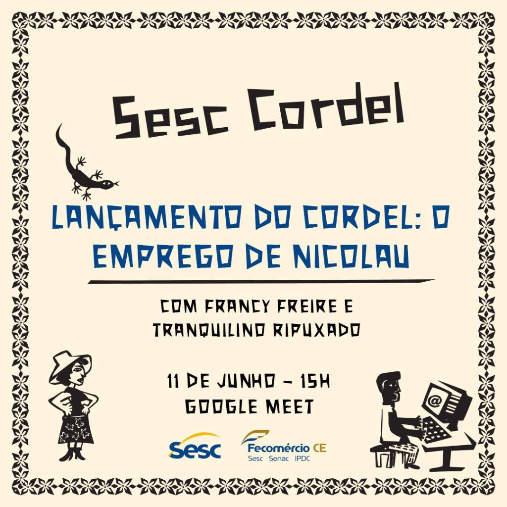 Nesta sexta, será lançado o cordel O Emprego de Nicolau, ao vivo pelo Google Meet, com Francy Freire e Tranquilino Ripuxado, não perca!