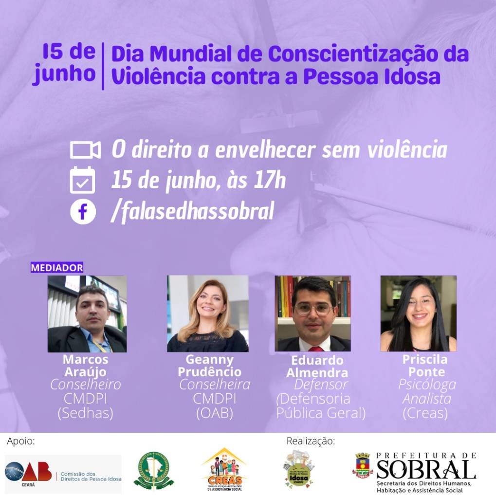 Em alusão ao Dia Internacional de Conscientização da Violência contra a Pessoa Idosa, celebardo no dia 15 de junho, o Conselho Municipal dos Direitos da Pessoa Idosa (CMDPI) de Sobral realizará uma live para discutir o assunto. O evento será realizado, na próxima terça-feira (15/06), com transmissão pelo facebook da Secretaria dos Direitos Humanos, Habitação e Assistência Social (Sedhas).