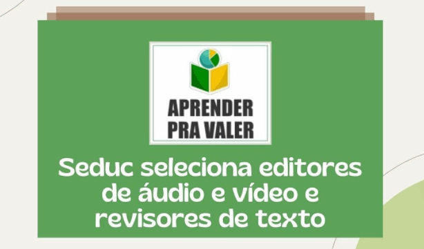A Secretaria da Educação (Seduc) lança chamada pública para a seleção de bolsistas para atuarem como editores de áudio e vídeo e revisores de texto, com conhecimento técnico no uso de tecnologias e metodologias educacionais, bem como da norma culta da língua portuguesa. Os profissionais atuarão no âmbito do Programa Aprender pra Valer e terão direito a bolsa mensal no valor de R$ 760,00, para o cumprimento de 20h semanais, durante o período de cinco meses. As inscrições ocorrem entre os dias 11 e 20 de junho de 2021, somente por meio virtual.