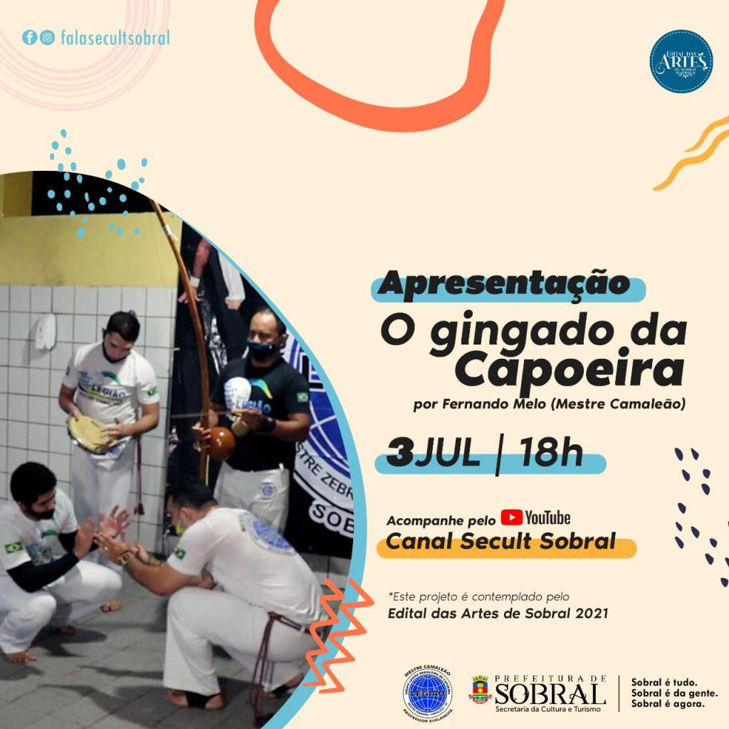 Neste sábado (03/07) , às 18h, no canal da Secult Sobral, no YouTube, acontecerá uma apresentação intitulada O gingado da capoeira.