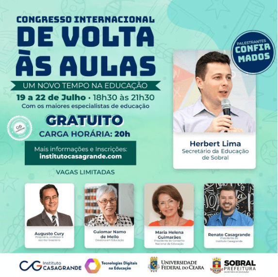 Estão abertas as inscrições para o Congresso Internacional de Volta às Aulas, que reunirá os maiores especialistas em educação do país. O evento será realizado de 19 a 22 de julho, a partir das 17h, pelo canal do Instituto Casagrande no YouTube (youtube.com/institutocasagrande).