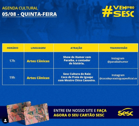 Festival Online Festa do Sol – Programa Sistema Solar – Episódio final, dia 07 de agosto, às 17h, na TVC (canais 5.1 digital, 5 Vivo, 17 NET, 17 Multiplay e 15 Brisanet). Site: www.festadosolce.com. Instagram: @festadosolce. Facebook: Festa do sol CE. Informações: festadosolce@gmail.com.