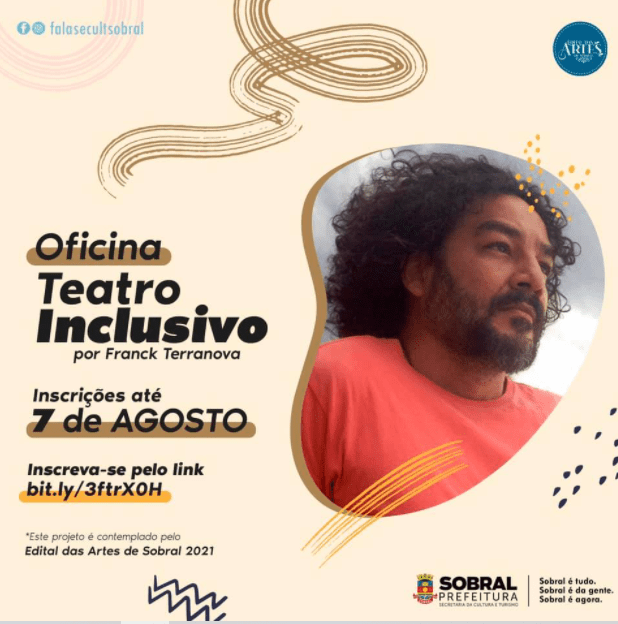Como todas as artes, o Teatro é para tod@s sem exceção! Por isso, entre 4 e 7 de agosto ficam abertas as inscrições para a Oficina Teatro Inclusivo por Franck Terranova, uma ação formativa selecionada pelo Edital das Artes 2021 da Secretaria de Cultura e Turismo (Secult).