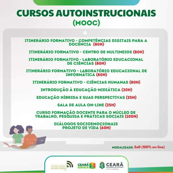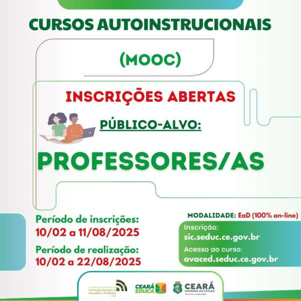 A Secretaria da Educação do Estado do Ceará (Seduc/CE), por meio da Coordenadoria Estadual de Formação Docente e Educação a Distância (Coded/CED), comunica que os cursos autoinstrucionais para professores/as, na modalidade Massive Open On-line Course (Mooc), estão disponíveis no Ambiente Virtual de Aprendizagem (Avaced). Alguns deles contam com a parceria da Coordenadoria de Gestão Pedagógica do Ensino Médio (Cogem) e do Instituto Palavra Aberta.