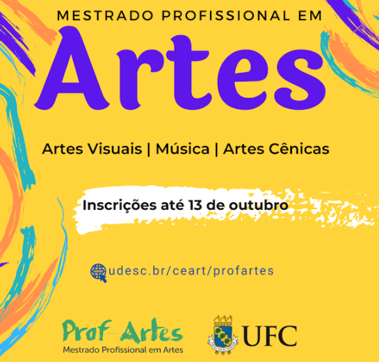 O programa Mestrado Profissional em Artes (PROF-Artes), do Instituto de Cultura e Arte da Universidade Federal do Ceará, associado à Rede Nacional PROF-Artes, está com inscrições abertas para o Exame Nacional de Acesso à nova turma, com ingresso no semestre 2022.1. As inscrições vão até as 23h59min do dia 13 de outubro.